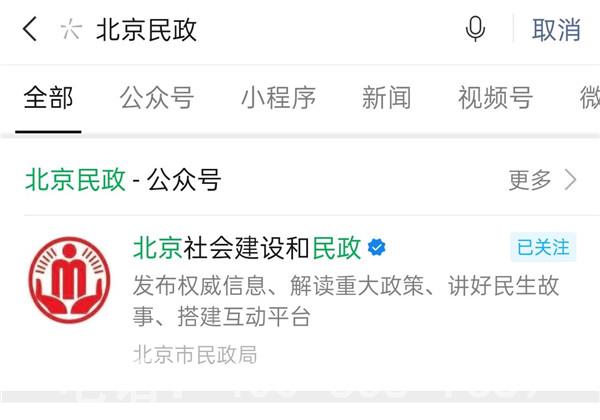 1.微信搜索“北京民政”微信官方账号,关注“北京社会建设与民政”微信官方账号;