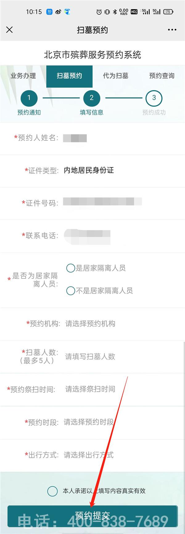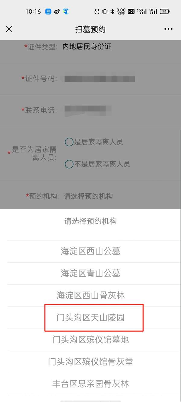 6.预约机构选择“门头沟区天山陵园”,然后根据提示完善个人信息并提交。